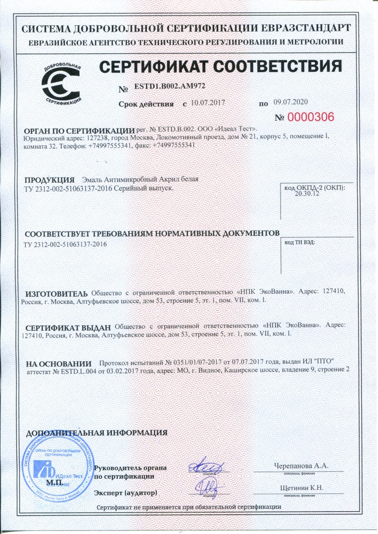Белый лакокрасочный материал с высокой массой нелетучих веществ. В состав материала входит сырье фирм Du Pont (США), Evonik (Германия), Byk Chemie (Германия). Материал используется для нанесения на чугунную или металлическую ванну в бытовых условиях без ее демонтажа. Может быть заколерован перед нанесением.